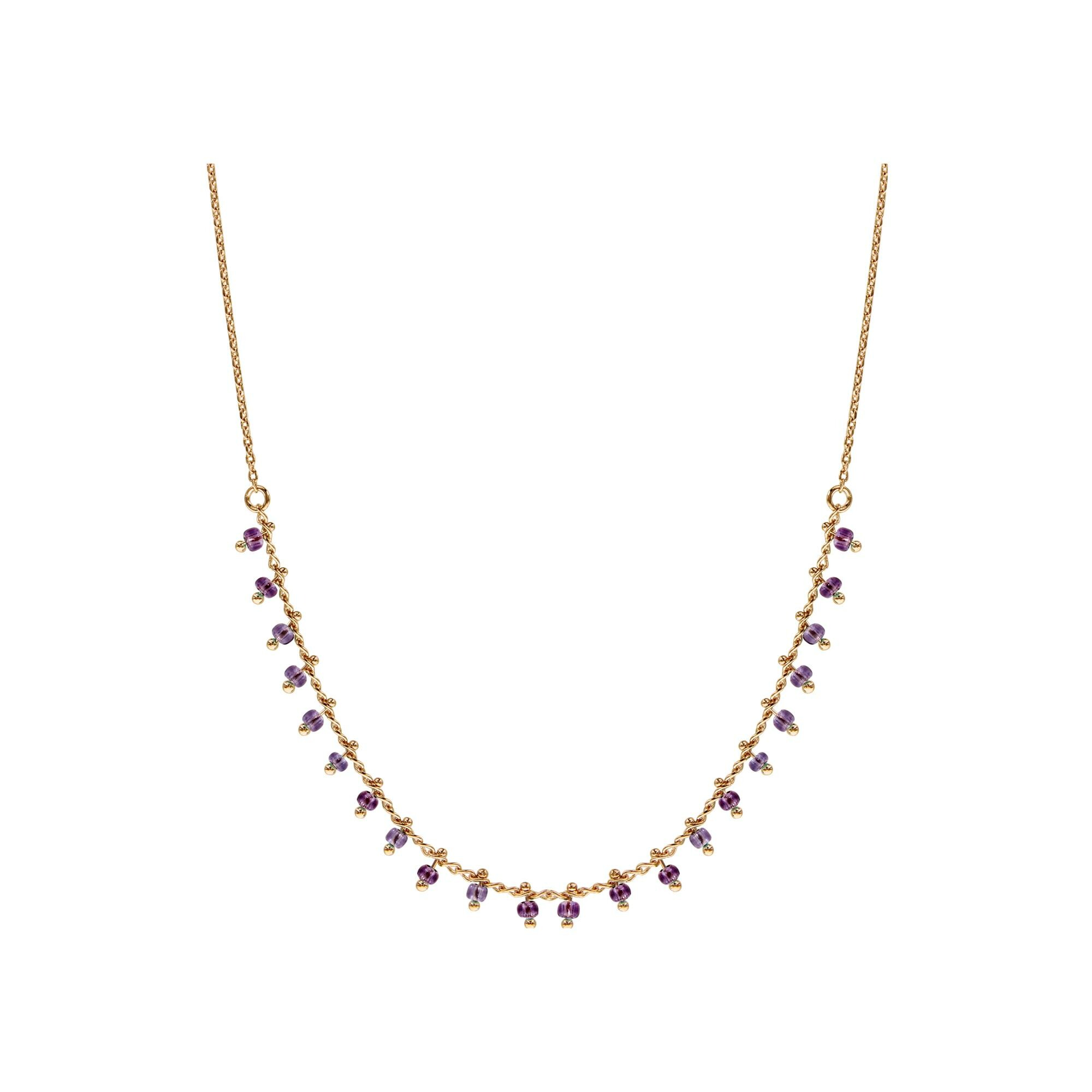 Collier plaqué or pampilles boules violettes 42cm